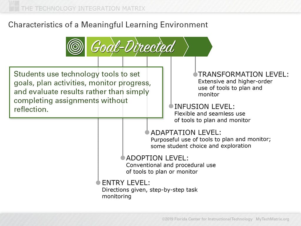 When the five characteristics of meaningful learning environments are evaluated using the five levels of technology integration, the Technology Integration Matrix (TIM) framework is created. Educators can use this matrix to evaluate and reflect upon their lessons, as well as a planning tool to improve student engagement and achievement