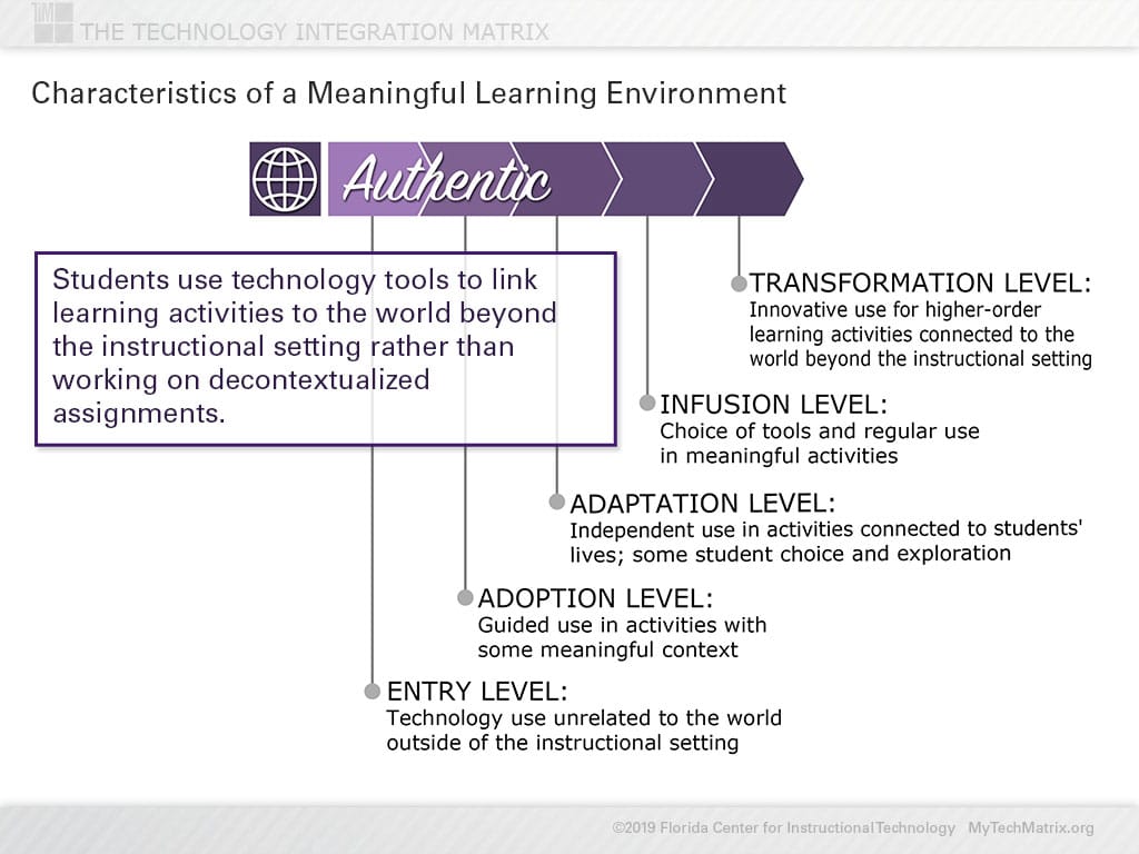 The Authentic characteristic of the Technology Integration Matrix emphasizes the connection between new learning and the world outside of the classroom. From the student’s point of view, the Authentic characteristic answers the questions, “Is this real or just another made-up school thing? Is this relevant to me now or at least relevant to what I’ll need later or in a future career? Will I ever need to know this once I’ve passed my final exam in this class?” (Source: https://fcit.usf.edu/matrix/authentic-learning-mirroring-the-real-world/)