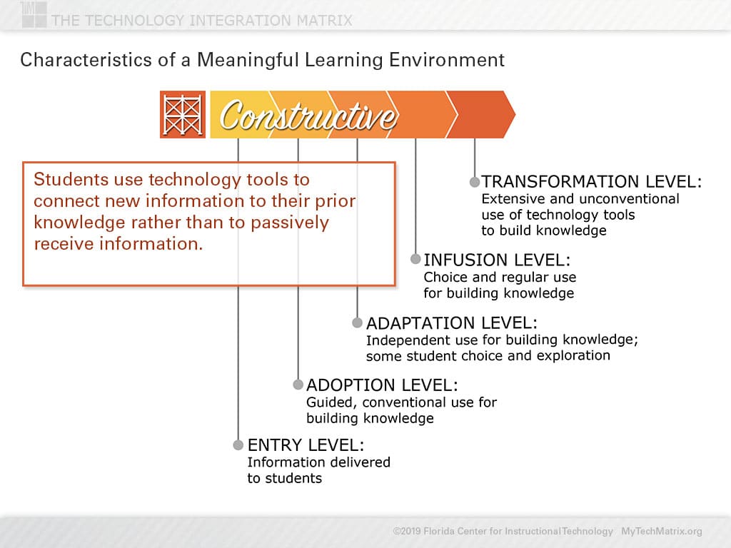 “The Constructive characteristic of the Technology Integration Matrix describes instruction in which students use technology tools to connect new information to their existing knowledge. Experienced teachers know well that with sufficient motivation, students can memorize and, in the short term, parrot back all sorts of information we teach them… But if the student hasn’t tied that information to something they already understand, it’s a structure built without a foundation and typically is soon lost.”